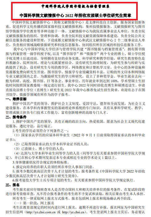 中國科學(xué)院文獻(xiàn)情報(bào)中心5月26日發(fā)布2022招生簡章,初復(fù)試要求、學(xué)費(fèi)考試費(fèi)用等內(nèi)容作了具體說明。