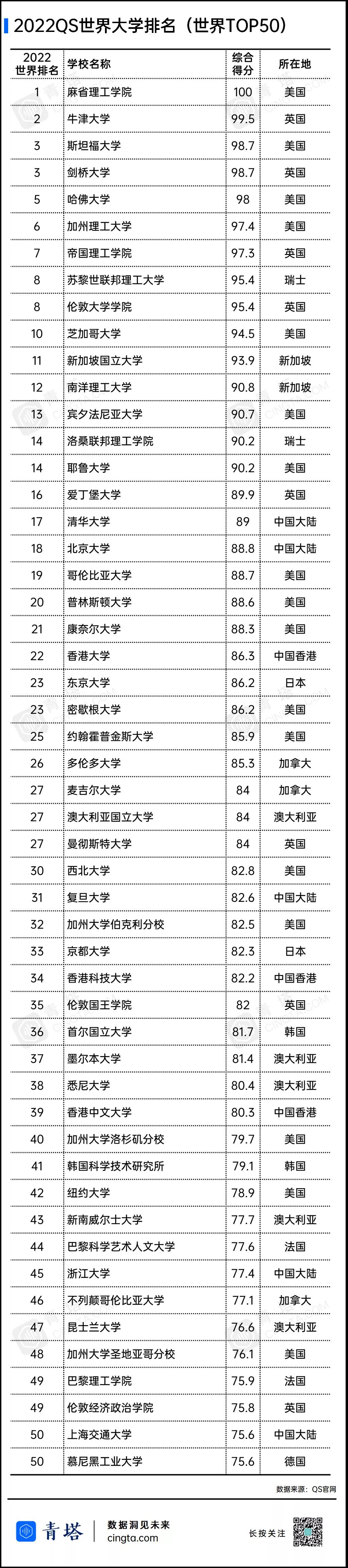QS 2022年世界大學(xué)排名TOP50 高校名單如下: