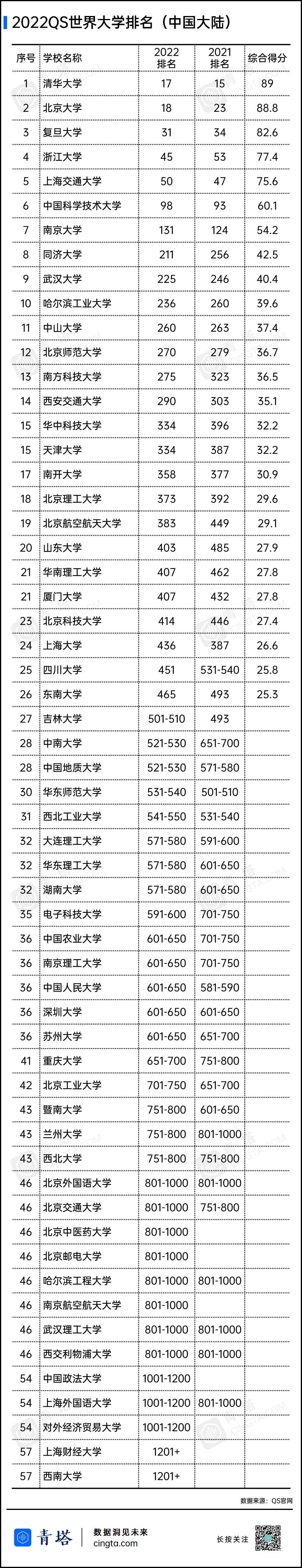 今年的QS世界大學(xué)排行榜共有58所中國(guó)內(nèi)地高校上榜。