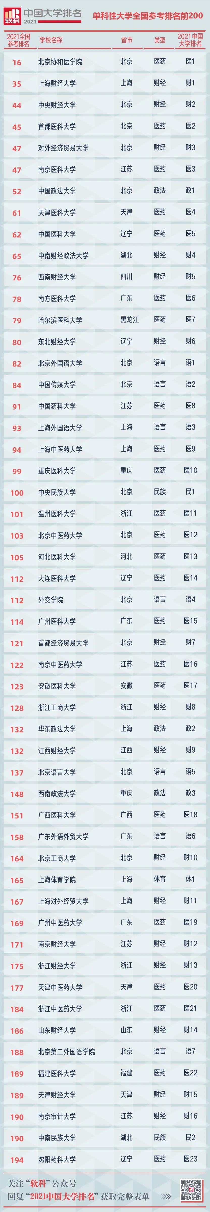 2021軟科中國(guó)大學(xué)排名遵循分類排名的原則,對(duì)6類單科性大學(xué)(醫(yī)藥類、財(cái)經(jīng)類、語(yǔ)言類、政法類、民族類、體育類)使用差異化指標(biāo)體系分別進(jìn)行排名。在每一類型的排名中,參與排名計(jì)算的不僅有本類型的大學(xué),也包括綜合性大學(xué)和所有其它類型的單科性大學(xué),最終給出了單科性大學(xué)在本類型的排名及其全國(guó)參考排名。
