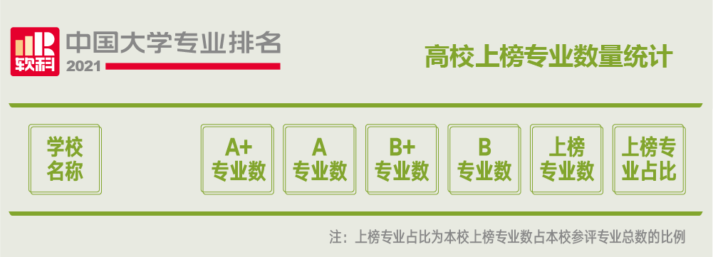 2021年6月22日,高等教育評價專業(yè)機(jī)構(gòu)軟科正式發(fā)布2021“軟科中國大學(xué)專業(yè)排名”。排名包括509個本科專業(yè),每個專業(yè)榜單發(fā)布的是所有開設(shè)該專業(yè)的高校中排名位列前50%的高校,共有925所高校的28550個專業(yè)上榜。“軟科中國大學(xué)專業(yè)排名”是迄今為止覆蓋專業(yè)數(shù)量最多、參評專業(yè)規(guī)模最大的中國大學(xué)本科專業(yè)排名。排名結(jié)果顯示,北京大學(xué)以102個A+專業(yè)遙遙領(lǐng)先,清華大學(xué)和浙江大學(xué)分別以59個和49個A+專業(yè)數(shù)位列全國第二和第三名,復(fù)旦大學(xué)和南京大學(xué)則以40個A+專業(yè)數(shù)并列全國第四名。