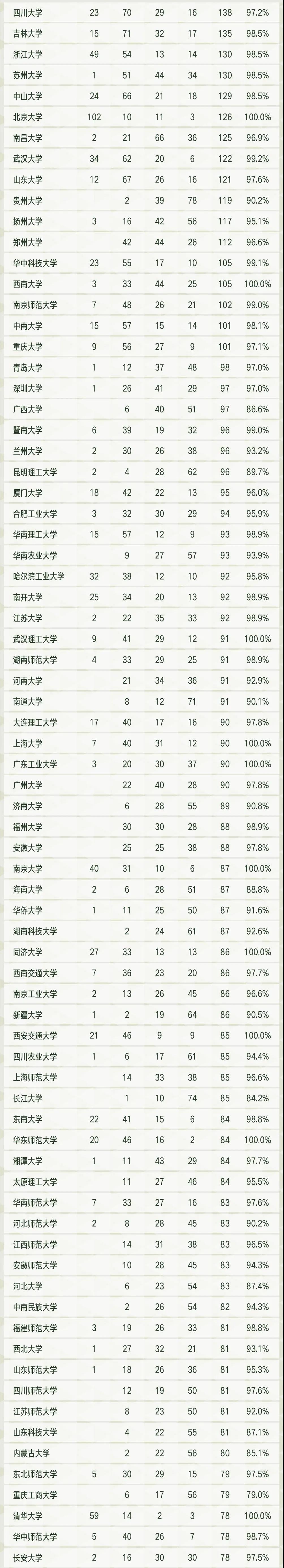 按照上榜專業(yè)數(shù)統(tǒng)計,四川大學(xué)有138個專業(yè)上榜,領(lǐng)先國內(nèi)其它高校;吉林大學(xué)排名第二,擁有135個上榜專業(yè)。浙江大學(xué)和蘇州大學(xué)則以130個上榜專業(yè)并列全國第三。其他上榜專業(yè)數(shù)位列全國前十的高校為中山大學(xué)(129個)、北京大學(xué)(126個)、南昌大學(xué)(125個)、武漢大學(xué)(122個)、山東大學(xué)(121個)、貴州大學(xué)(119個)。“雙一流”高校中,鄭州大學(xué)、華中科技大學(xué)、西南大學(xué)、南京師范大學(xué)、中南大學(xué)、重慶大學(xué)的上榜專業(yè)數(shù)也都超過100個。