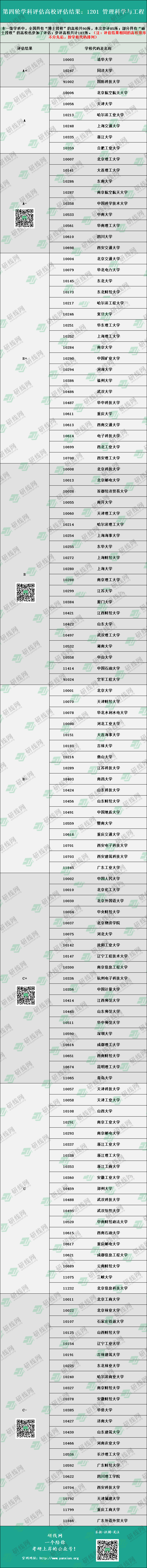 下面是全國第四輪學(xué)科評估結(jié)果 1201管理科學(xué)與工程 的院校排名,供大家擇校參考。(注:評估結(jié)果相同的高校排序不分先后,按學(xué)校代碼排列)
