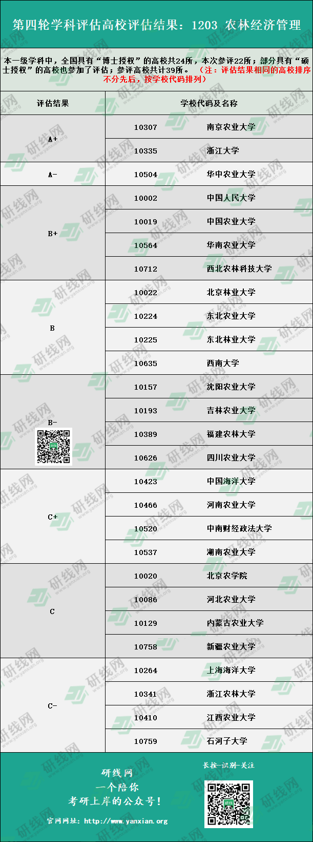 下面是全國第四輪學(xué)科評(píng)估結(jié)果 1203 農(nóng)林經(jīng)濟(jì)管理 的院校排名,供大家擇校參考。(注:評(píng)估結(jié)果相同的高校排序不分先后,按學(xué)校代碼排列)