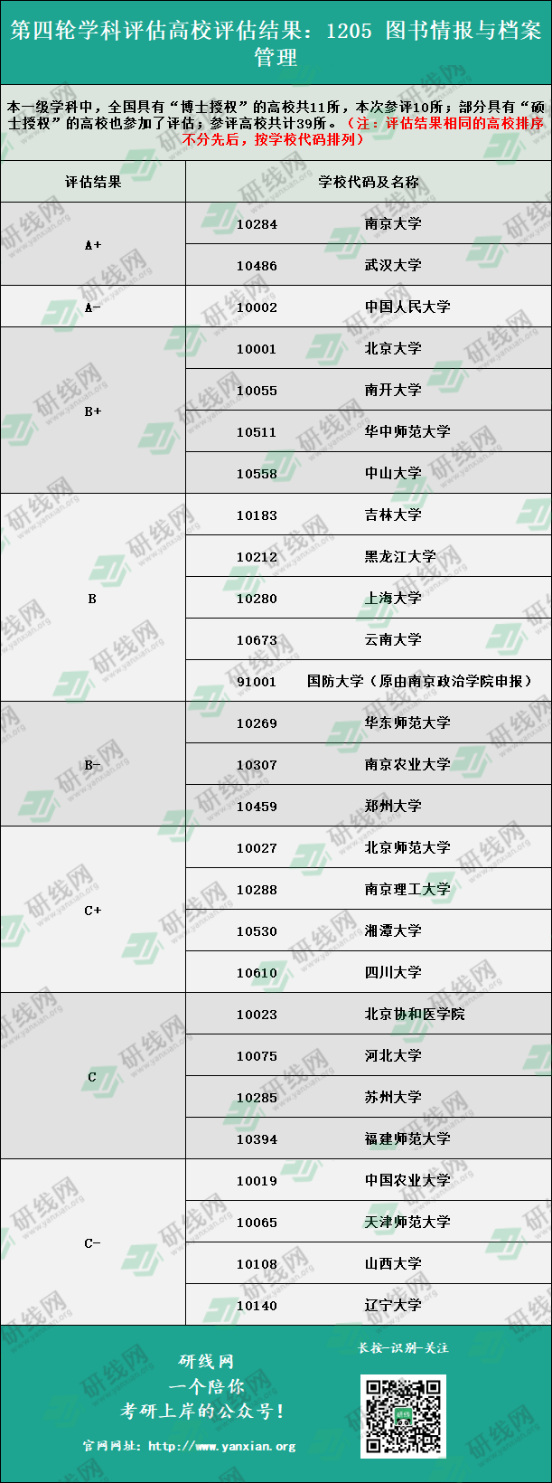 下面是全國第四輪學(xué)科評(píng)估結(jié)果1205圖書情報(bào)與檔案管理的院校排名,供大家擇校參考。(注:評(píng)估結(jié)果相同的高校排序不分先后,按學(xué)校代碼排列)