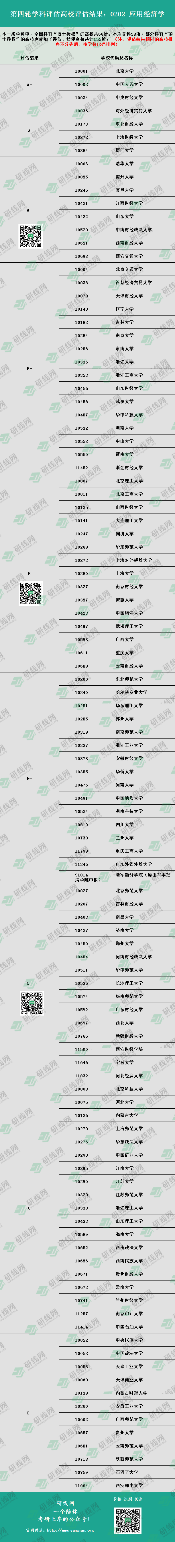 下面是全國第四輪學(xué)科評估結(jié)果 0202 應(yīng)用經(jīng)濟(jì)學(xué) 的院校排名,供大家擇校參考。(注:評估結(jié)果相同的高校排序不分先后,按學(xué)校代碼排列)