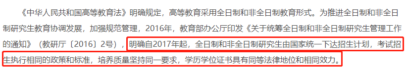 教育部辦公廳早在去年發(fā)布了《關(guān)于進(jìn)一步做好非全日制研究生就業(yè)工作的通知》,明確自2017年起,全日制和非全日制研究生由國家統(tǒng)一下達(dá)招生計(jì)劃,考生招生執(zhí)行相同的政策和標(biāo)準(zhǔn),培養(yǎng)質(zhì)量堅(jiān)持統(tǒng)一要求,學(xué)歷學(xué)位證書具有同等法律地位和效力。