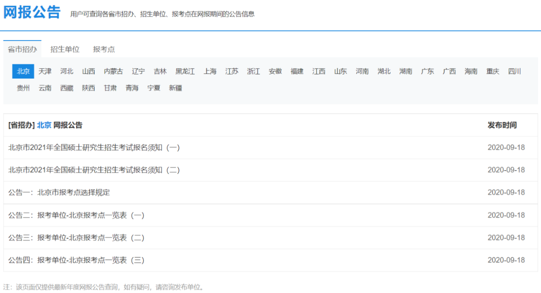 如果你想查詢各省市招辦、招生單位、報考點(diǎn)在網(wǎng)報期間的公告信息,就需要看看往年該地網(wǎng)報公告上的一些要求,網(wǎng)報公告版塊會集中展示省市招辦、招生單位、報考點(diǎn)在網(wǎng)報期間報考的要求。