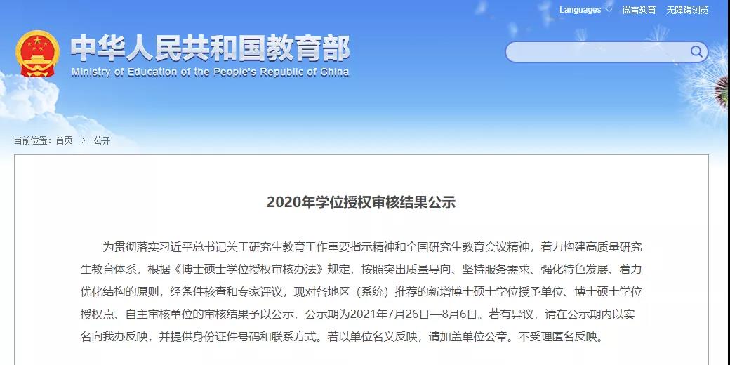 7月26日,教育部發(fā)布《2020年學(xué)位授權(quán)審核結(jié)果公示》,一起來看~