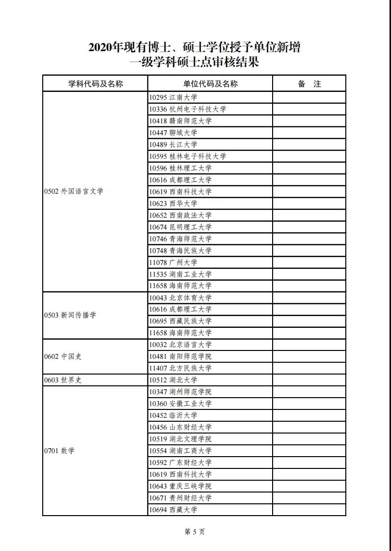 5.2020年現(xiàn)有博士、碩士學(xué)位授予單位新增一級(jí)學(xué)科碩士點(diǎn)審核結(jié)果(部分)