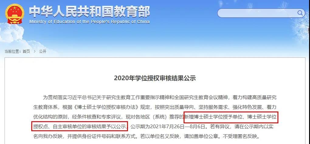 7月26日,教育部發(fā)布《2020年學(xué)位授權(quán)審核結(jié)果公示》,對(duì)各地區(qū)(系統(tǒng))推薦的