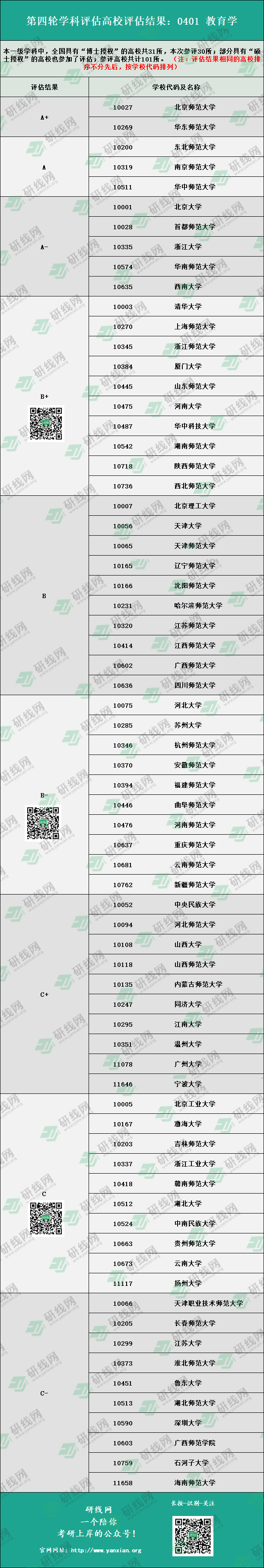 下面是全國(guó)第四輪學(xué)科評(píng)估結(jié)果[0401 教育學(xué)]的院校排名,供大家擇校參考。(注:評(píng)估結(jié)果相同的高校排序不分先后,按學(xué)校代碼排列)