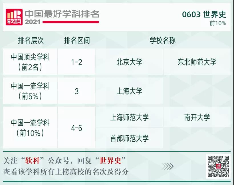 世界史學(xué)科排名前10%的高校: