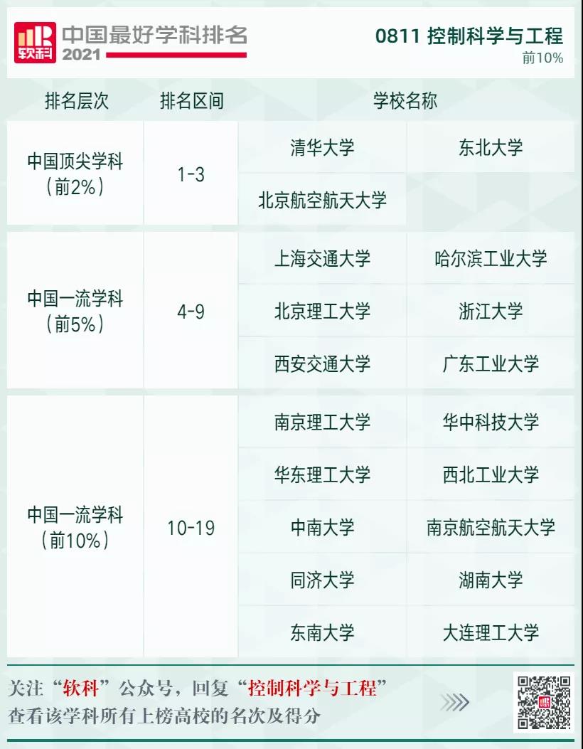 控制科學(xué)與工程學(xué)科排名前10%的高校: