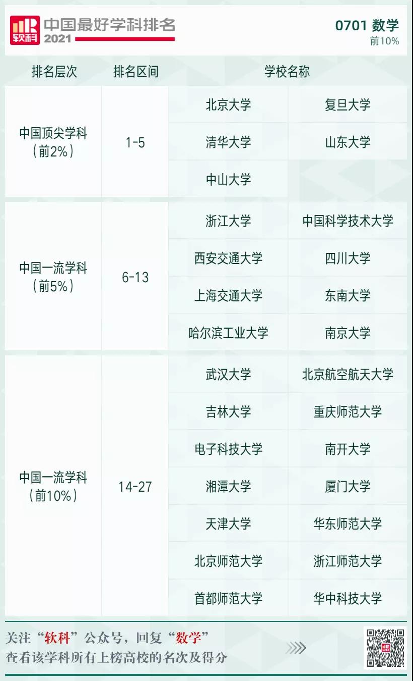 數(shù)學(xué)學(xué)科排名前10%的高校:
