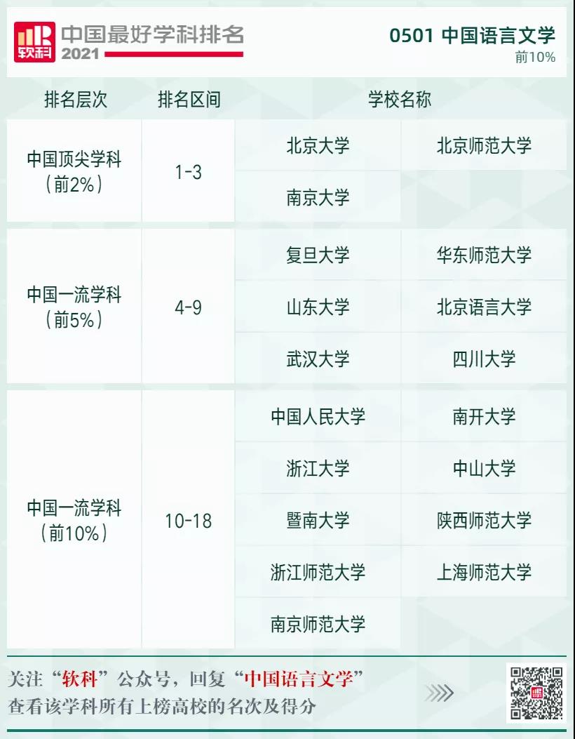 中國語言文學(xué)學(xué)科排名前10%的高校: