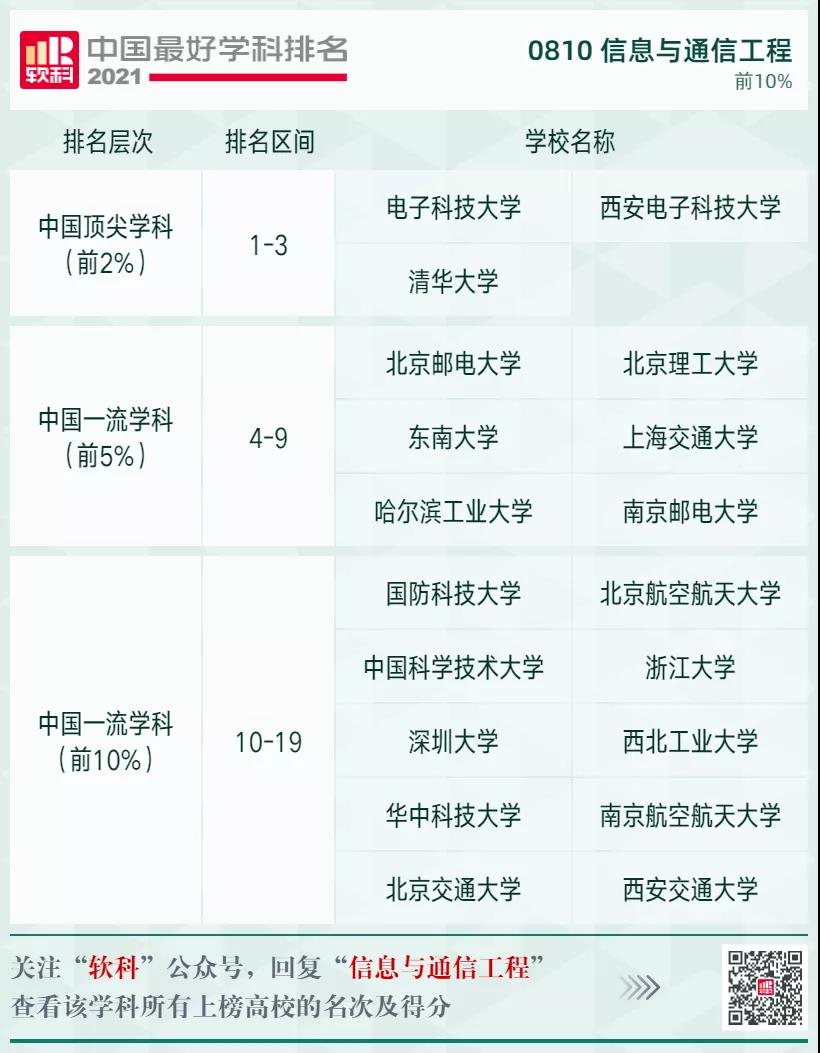 信息與通信工程學(xué)科排名前10%的高校: