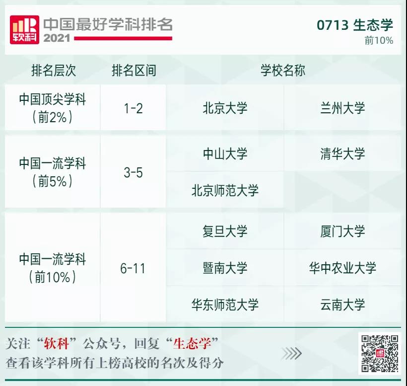 生態(tài)學(xué)學(xué)科排名前10%的高校: