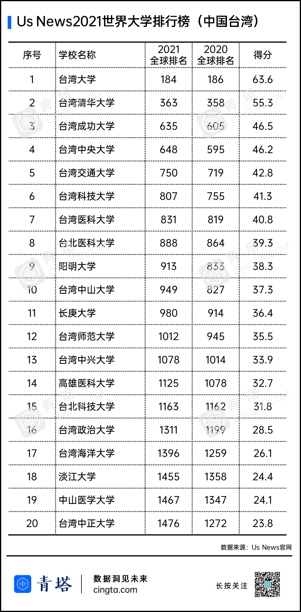 中國臺(tái)灣地區(qū)共有21所高校上榜,其中排名最高的是臺(tái)灣大學(xué),排名全球184位。輔仁大學(xué)1381名,得分26.4