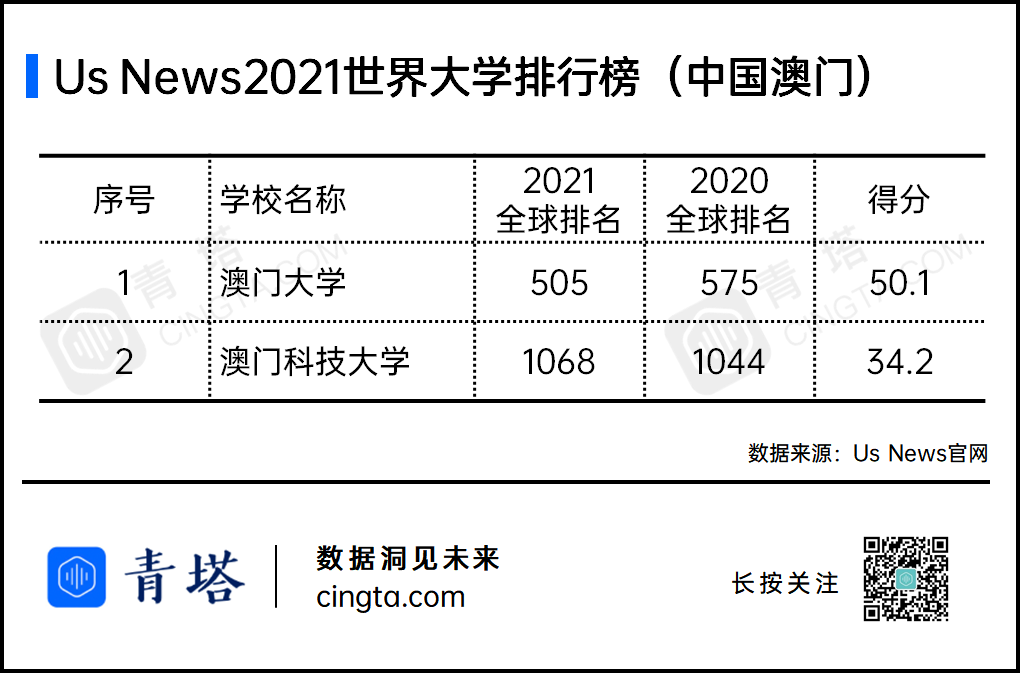 中國澳門地區(qū)共有2所高校上榜,其中澳門大學(xué)位居全球505位,澳門科技大學(xué)居全球1068位。