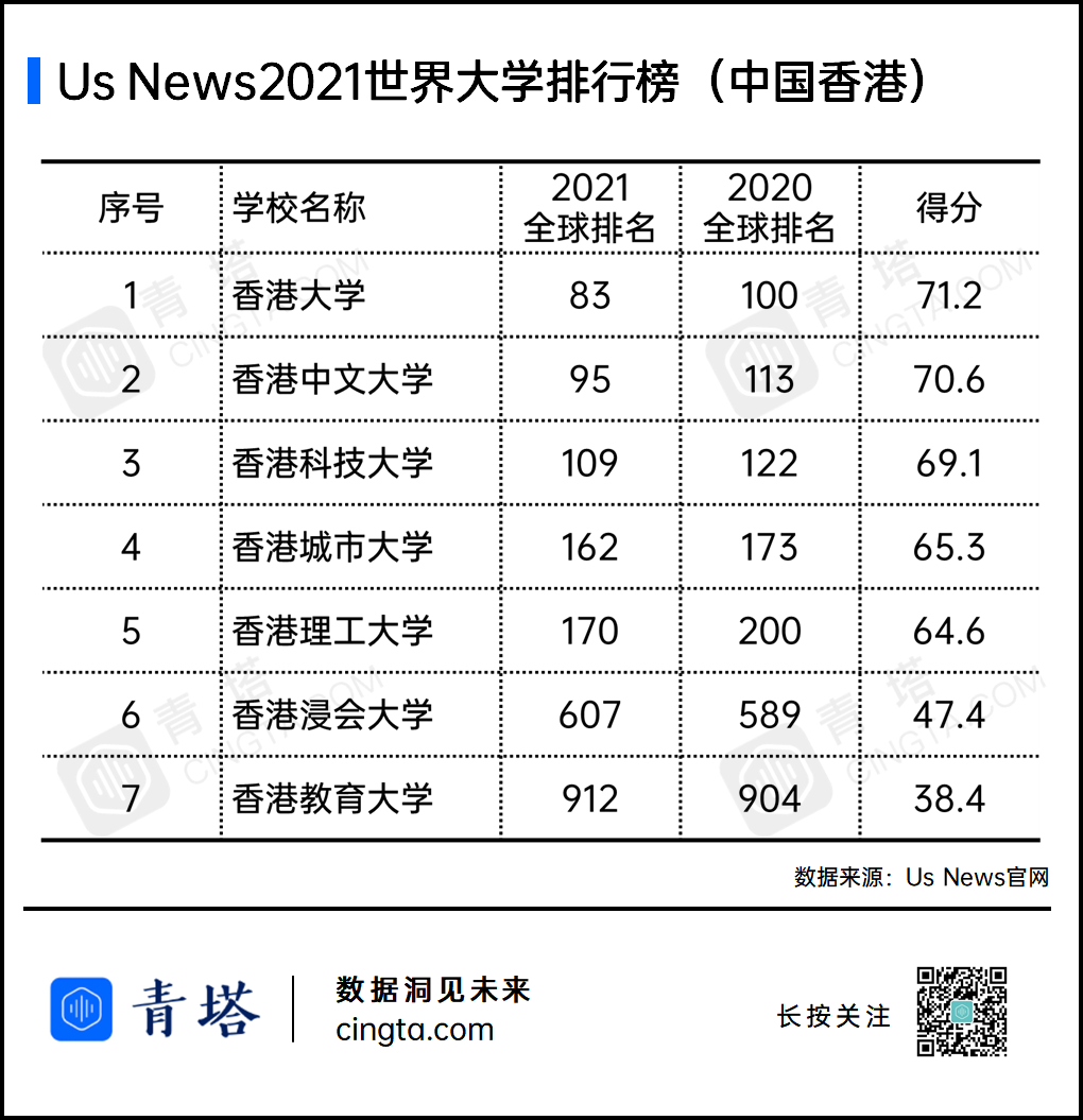中國香港地區(qū)共有7所高校上榜,排名最高的是香港大學(xué),居全球83位。