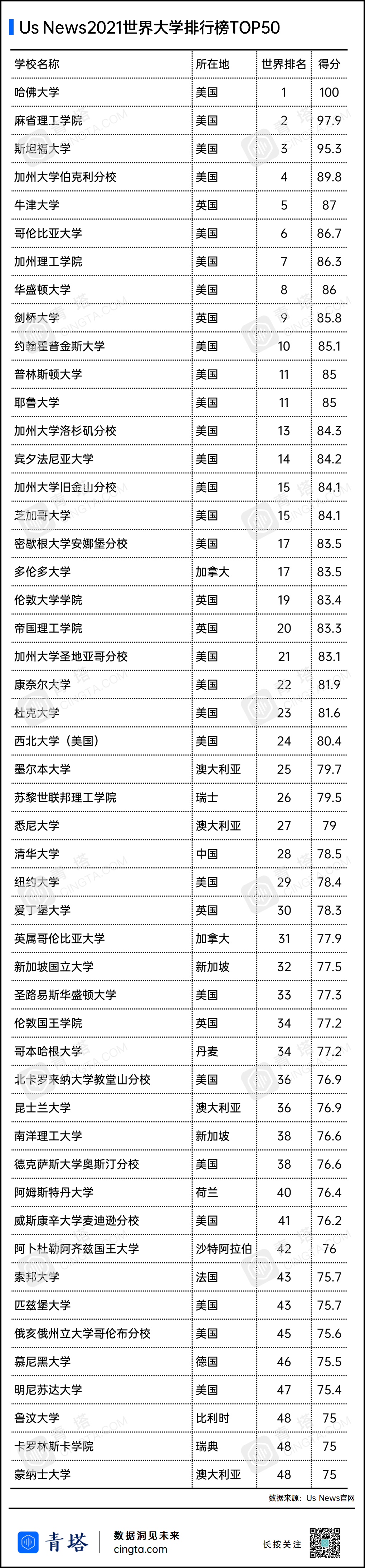 USNews2021世界大學(xué)排行榜TOP50高校詳細(xì)名單如下: