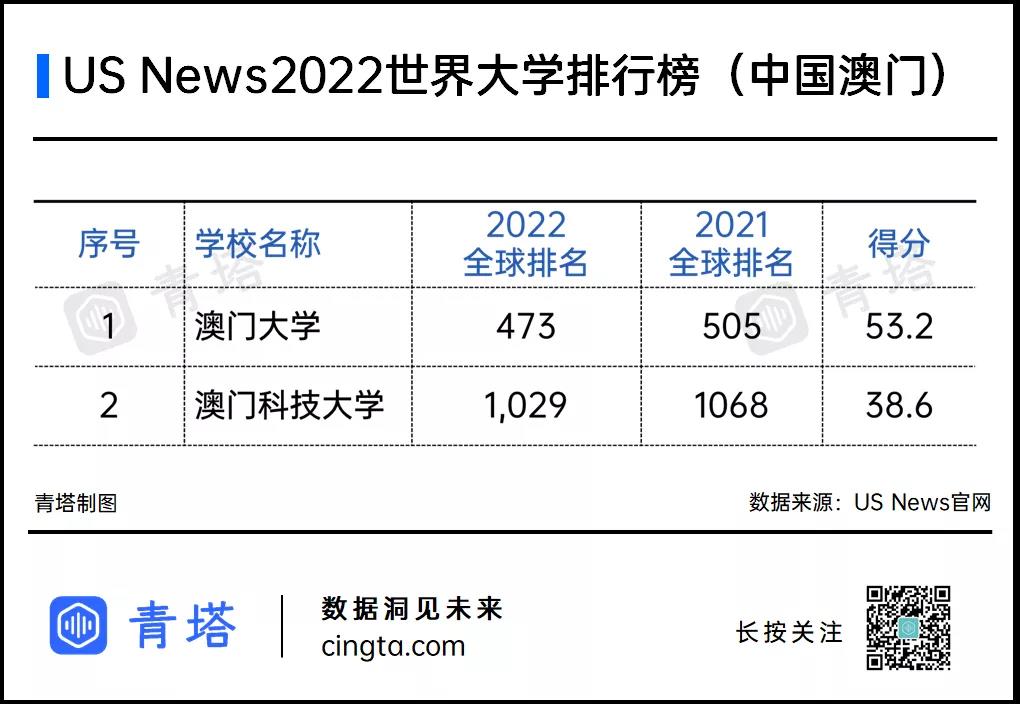 中國(guó)澳門(mén)地區(qū)共有2所高校上榜,其中澳門(mén)大學(xué)位居全球473位,澳門(mén)科技大學(xué)居全球1029位。