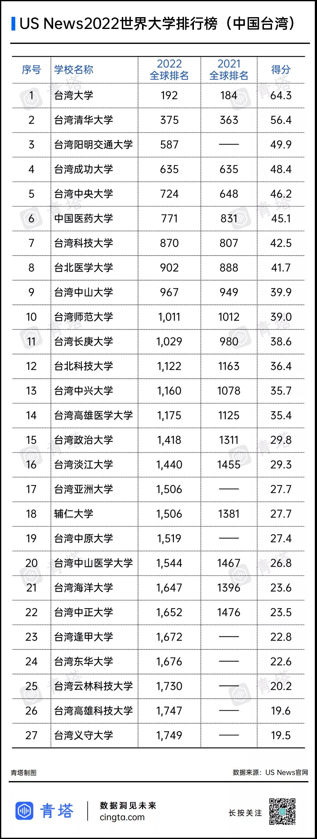 中國(guó)臺(tái)灣地區(qū)共有27所高校上榜,其中排名最高的是臺(tái)灣大學(xué),排名全球192位。