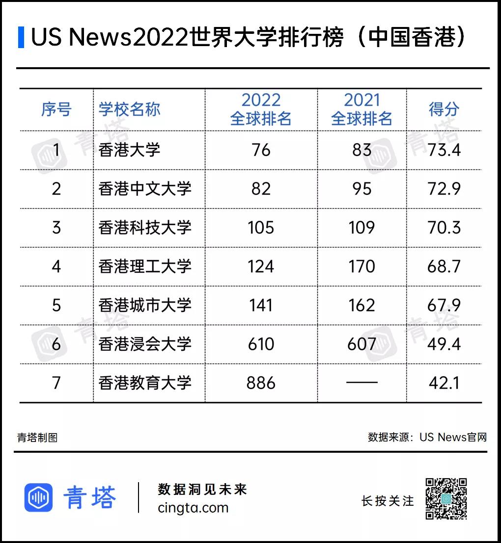中國(guó)香港地區(qū)共有7所高校上榜,排名最高的是香港大學(xué),居全球76位。
