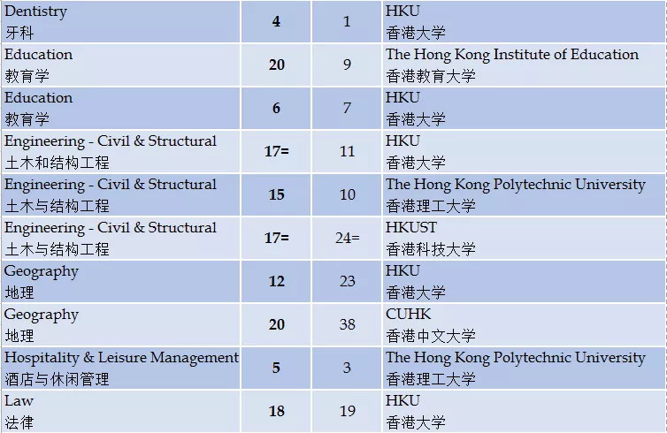 香港地區(qū)高校也表現(xiàn)不凡,香港大學(xué)的牙科排名世界第4,其教育研究學(xué)排名從世界第7位上升至第6位,而香港理工大學(xué)的酒店及休閑管理學(xué)科排名世界第五。