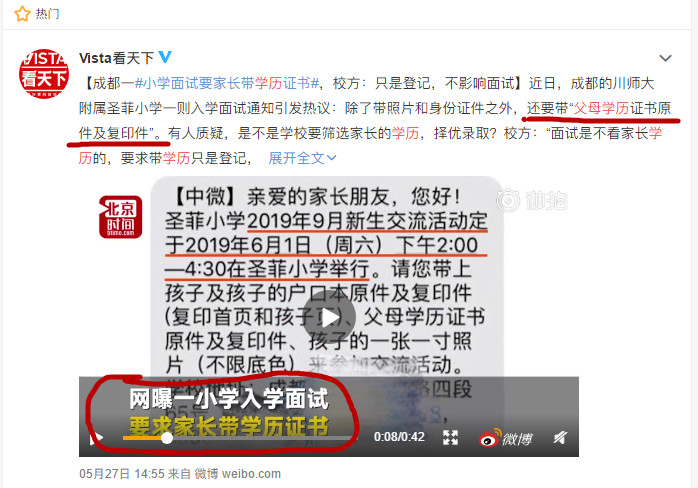 近日,有一條新聞引發(fā)網(wǎng)友熱議。成都某小學(xué)入學(xué)面試,要求家長(zhǎng)除了帶照片和身份證件之外,還要帶“父母學(xué)歷證書原件及復(fù)印件”。