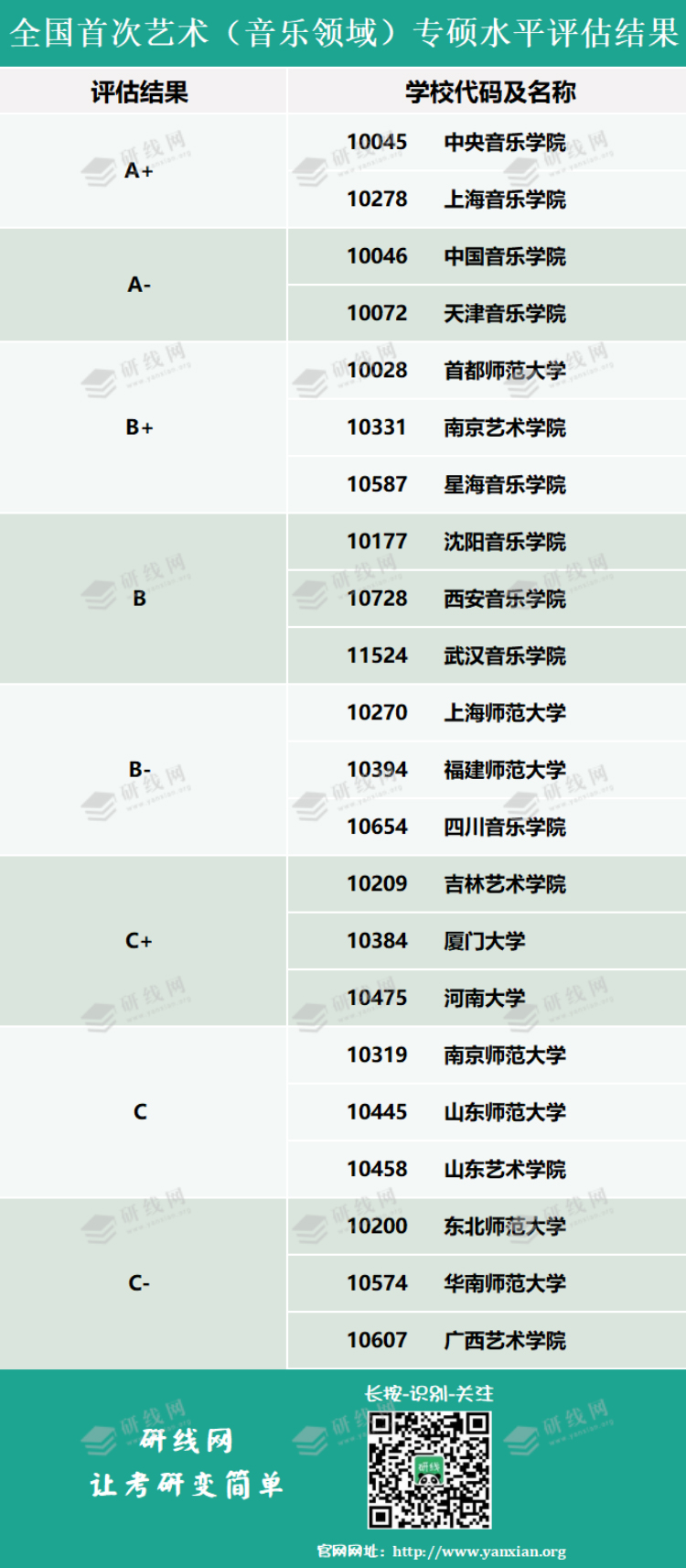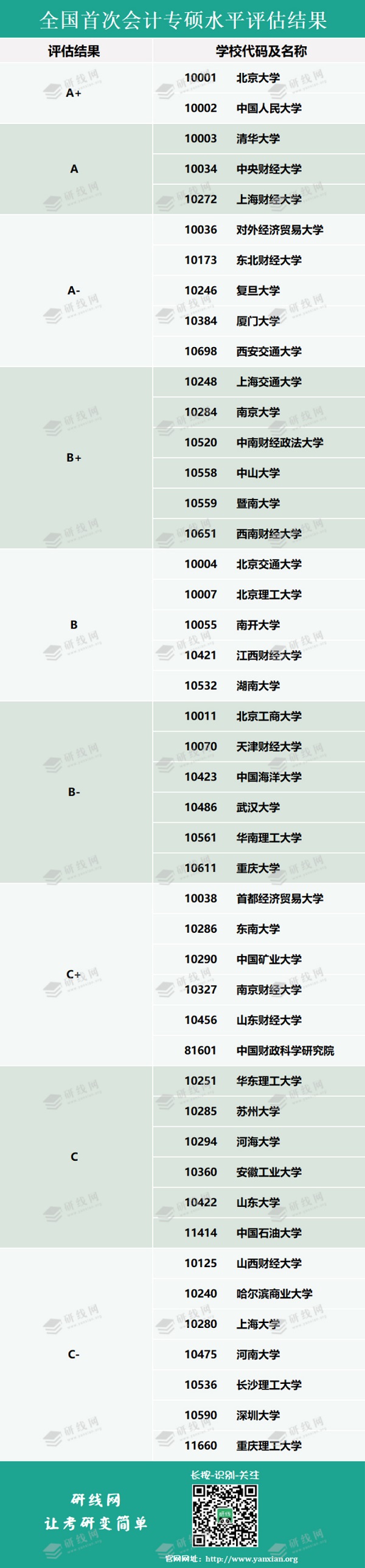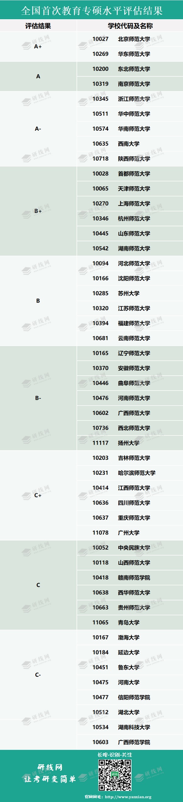 評估結果通過精準計算,按“分檔”呈現(xiàn),具體方法是按“專業(yè)學位整體水平得分”的位次百分位,將每個專業(yè)學位類別前75%的參評單位分為9檔公布:前2%(或前2名)為A+,2%——7%為A(不含2%,下同),7%——15%為A-,15%——25%為B+,25%——35%為B,35%——45%為B-,45%——55%為C+,55%——65%為C,65%——75%為C-。