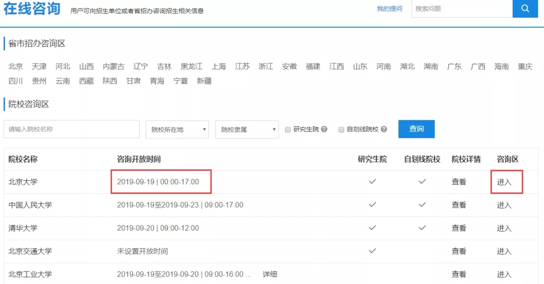 可以看到北京大學(xué)咨詢(xún)的開(kāi)放時(shí)間是9.19號(hào)零點(diǎn)到下午五點(diǎn),每所院校開(kāi)放咨詢(xún)時(shí)間不同,同學(xué)們要提前看清,然后點(diǎn)擊「進(jìn)入」。