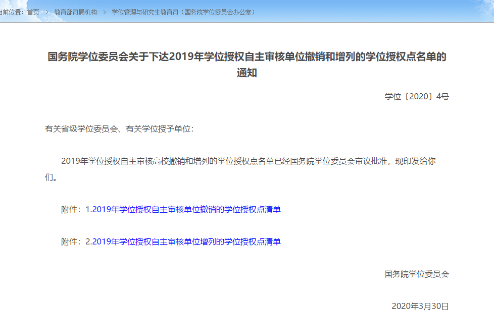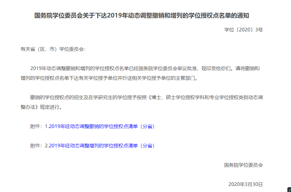 剛剛通知!4月2日,學(xué)位管理與研究生教育司在教育部官網(wǎng)發(fā)布了《國務(wù)院學(xué)位委員會關(guān)于下達(dá)2019年動態(tài)調(diào)整撤銷和增列的學(xué)位授權(quán)點(diǎn)名單的通知》,公布了2019年動態(tài)調(diào)整撤銷和增列的學(xué)位授權(quán)點(diǎn)名單。原文如下: