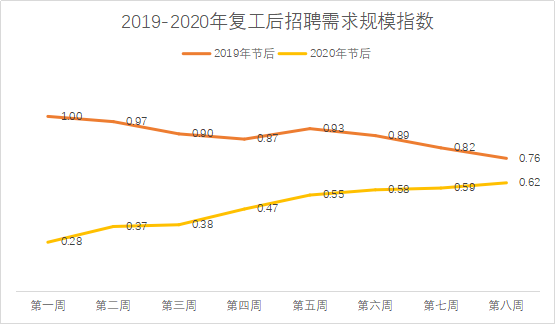 注:需求規(guī)模指數(shù)=指以2019年復(fù)工第一周招聘職位數(shù)為基數(shù),反映企業(yè)招聘需求逐周變化的指數(shù)。