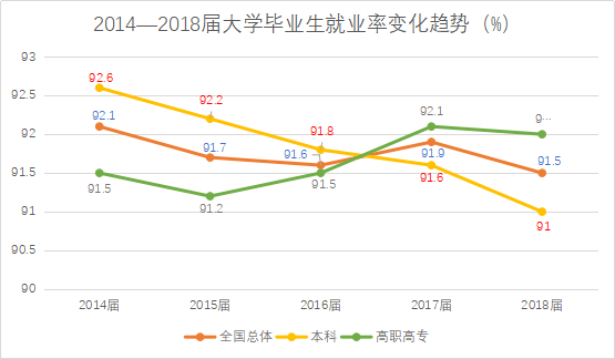 在招聘需求規(guī)模下降的同時,應(yīng)屆生人數(shù)卻屢創(chuàng)歷史新高。據(jù)教育部官網(wǎng)信息,2020屆高校畢業(yè)生規(guī)模預(yù)計將達到874萬人,同比增加40萬人。同時,根據(jù)麥可思研究院發(fā)布的《2019年中國大學生就業(yè)報告》數(shù)據(jù)顯示,本科畢業(yè)生的就業(yè)率呈現(xiàn)持續(xù)緩慢下降的現(xiàn)象,2018屆本科畢業(yè)生就業(yè)率為91.0%。