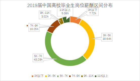 此外,根據(jù)梧桐果相關(guān)數(shù)據(jù)顯示,2019屆中國高校畢業(yè)生崗位薪酬區(qū)間的主流分布區(qū)間為5000—7000元,占比43.29%;而3000-5000元區(qū)間和3000元以下區(qū)間的占比分別為30.64%和7.72%,近四成應(yīng)屆畢業(yè)生的崗位薪酬還未達到5000元;7000元以上區(qū)間的占比為18.35%,其中11000元以上的占比僅為5.08%,高薪者極少。