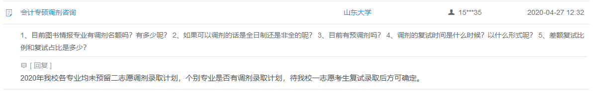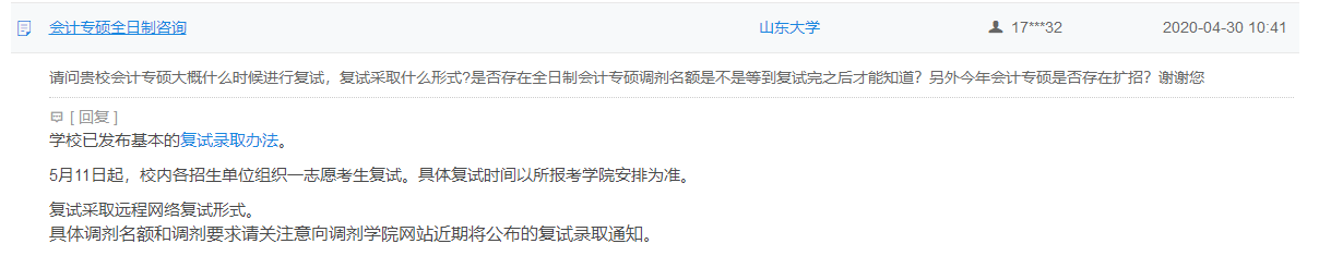 考研復(fù)試網(wǎng)上咨詢已經(jīng)開通,從4月26日-4月30日,教育部將在“中國研究生招生信息網(wǎng)”組織“2020年研考招生復(fù)試網(wǎng)上咨詢”,各招生單位將在線為考生答疑解惑。為方便2020考研的考生獲得有價(jià)值的信息,我們將對(duì)院校的答復(fù)進(jìn)行整理,為同學(xué)們搜羅有關(guān)復(fù)試線,復(fù)試形式,調(diào)劑名額等相關(guān)的考研內(nèi)容,以下是“2020考研復(fù)試網(wǎng)上咨詢:山東大學(xué)關(guān)于復(fù)試,調(diào)劑的問題答疑匯總”,希望對(duì)大家有所幫助!