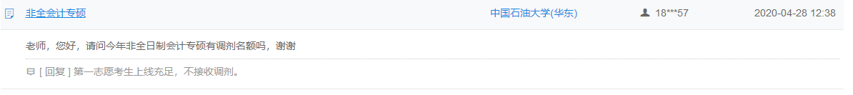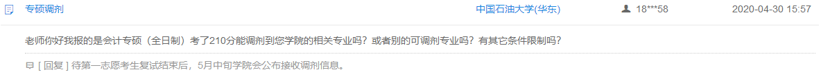 以上就是小編整理的“中國(guó)石油大學(xué)”相關(guān)考研內(nèi)容,更多關(guān)于“2020考研復(fù)試網(wǎng)上咨詢”的內(nèi)容,盡在“考研動(dòng)態(tài)”欄目,也可關(guān)注研線網(wǎng)微信公眾號(hào),第一時(shí)間獲取有效信息。問:老師,您好。我初始考了185分,想要調(diào)劑到貴校會(huì)計(jì)專碩(非全日制),請(qǐng)問有沒有可能,麻煩您在方便的時(shí)候回復(fù)一下,以便我盡早地做好準(zhǔn)備。非常感謝。
