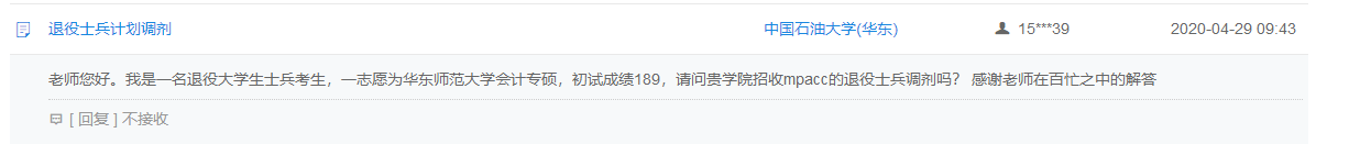問:老師您好。我是一名退役大學(xué)生士兵考生,一志愿為華東師范大學(xué)會(huì)計(jì)專碩,初試成績(jī)189,請(qǐng)問貴學(xué)院招收mpacc的退役士兵調(diào)劑嗎? 感謝老師在百忙之中的解答