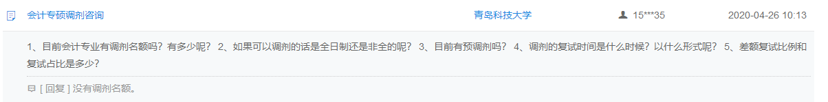 問:1、目前會(huì)計(jì)專業(yè)有調(diào)劑名額嗎?有多少呢? 2、如果可以調(diào)劑的話是全日制還是非全的呢? 3、目前有預(yù)調(diào)劑嗎? 4、調(diào)劑的復(fù)試時(shí)間是什么時(shí)候?以什么形式呢? 5、差額復(fù)試比例和復(fù)試占比是多少?