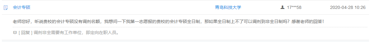 問:老師您好,聽說貴校的會(huì)計(jì)專碩沒有調(diào)劑名額,我想問一下我第一志愿報(bào)的貴校的會(huì)計(jì)專碩全日制,那如果全日制上不了可以調(diào)劑到非全日制嗎?感謝老師的回答!