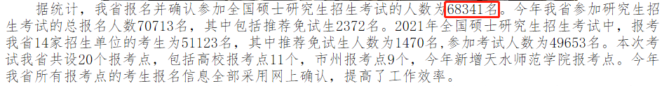 甘肅省教育考試院:甘肅省報(bào)名并確認(rèn)參加全國(guó)碩士研究生招生考試的人數(shù)為68341名,參加研究生招生考試的總報(bào)名人數(shù)為70713名,其中包括推薦免試生2372名。