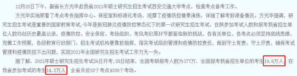 陜西招生考試信息網(wǎng):全國(guó)報(bào)考陜西省招生單位的考生為19.6萬(wàn)人,在陜西省參加考試的考生有14.2萬(wàn)人。