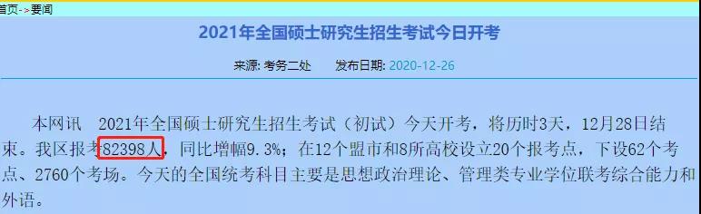 內(nèi)蒙古招生考試信息網(wǎng):內(nèi)蒙古2021年碩士研究生考生報(bào)考82398人,同比增幅9.3%。