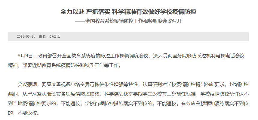 最近,隨著國(guó)內(nèi)疫情形勢(shì)的加重、大學(xué)生返校日期的逐漸臨近,疫情防控形勢(shì)越發(fā)嚴(yán)峻。教育部于8月9日召開(kāi)全國(guó)教育系統(tǒng)疫情防控工作視頻調(diào)度會(huì)議,深入貫徹國(guó)務(wù)院聯(lián)防聯(lián)控機(jī)制電視電話會(huì)議精神,部署近期教育系統(tǒng)疫情防控和秋季開(kāi)學(xué)等工作,一起來(lái)看!