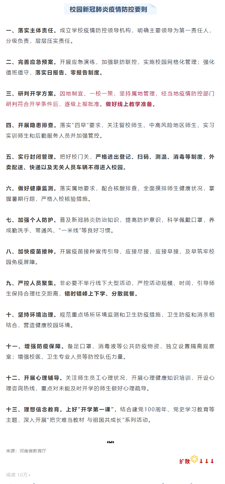 文中明確指出:因地制宜、一校一策,堅(jiān)持屬地管理,經(jīng)當(dāng)?shù)匾咔榉揽夭块T(mén)研判符合開(kāi)學(xué)條件后,逐級(jí)上報(bào)批準(zhǔn)。做好線上教學(xué)準(zhǔn)備。