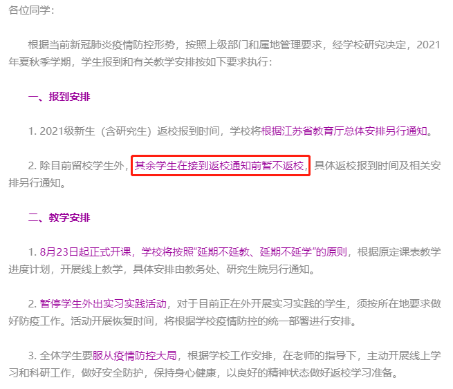 1. 2021級(jí)新生(含研究生)返校報(bào)到時(shí)間,學(xué)校將根據(jù)江蘇省教育廳總體安排另行通知。