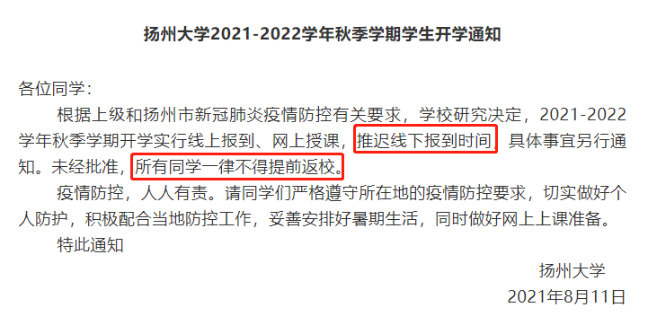 8月11日,揚(yáng)州大學(xué)官方微信公眾號(hào)發(fā)布《揚(yáng)州大學(xué)2021-2022學(xué)年秋季學(xué)期學(xué)生開(kāi)學(xué)通知》。