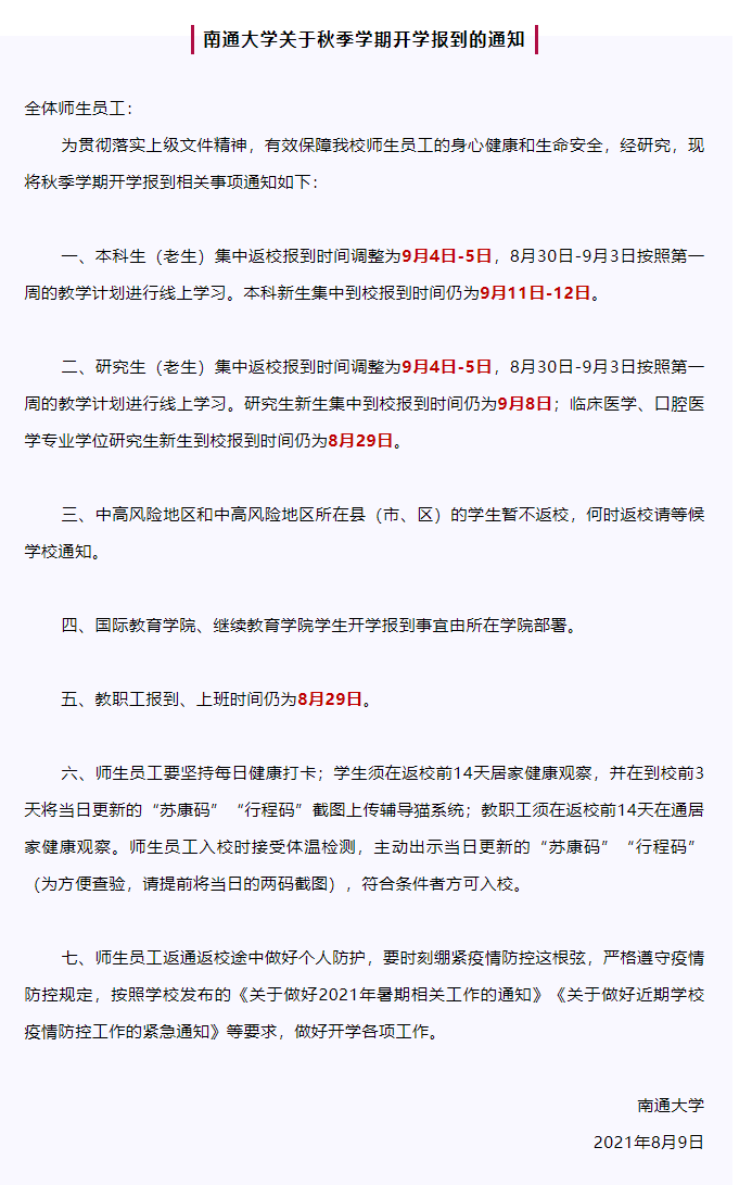8月10日,南通大學(xué)官方微信公眾號(hào)發(fā)布《南通大學(xué)關(guān)于秋季學(xué)期開(kāi)學(xué)報(bào)到的通知》。